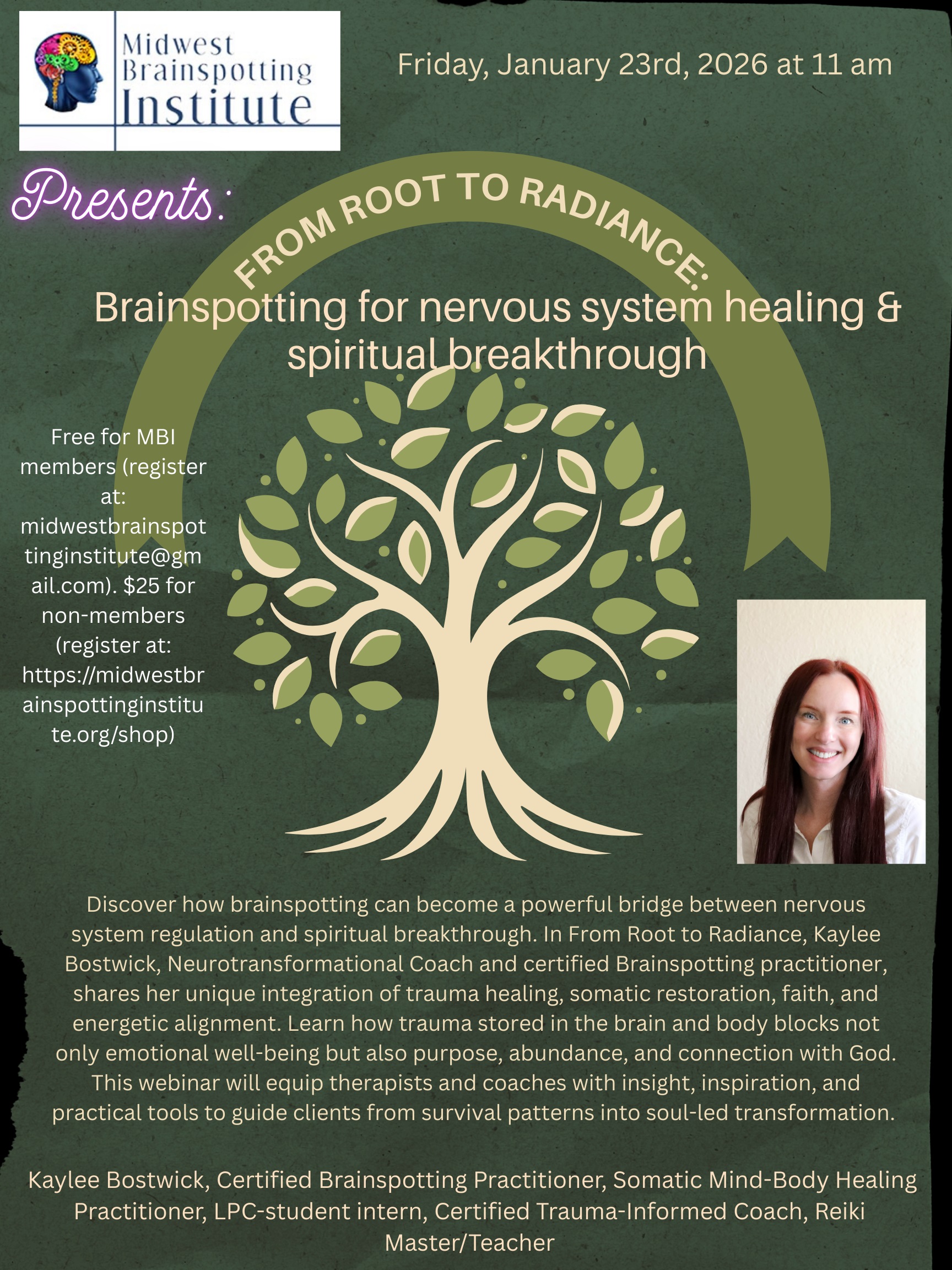 Discover how brainspotting can become a powerful bridge between nervous system regulation and spiritual breakthrough. In From Root to Radiance, Kaylee Bostwick- LPC intern, Coach, and Certified Brainspotting Practitioner, shares her unique integration of trauma healing, somatic restoration, faith, and energetic alignment. Learn how trauma stored in the brain and body blocks not only emotional well-being but also purpose, abundance, and connection with God. This webinar will equip therapists and coaches with insight, inspiration, and practical tools to guide clients from survival patterns into soul-led transformation.